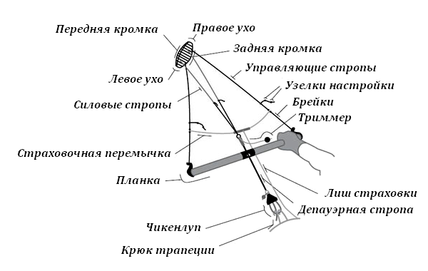 Трапеция снимает нагрузку с предплечий рук. Без неё, при движении с кайтом, сил хватит на десять минут. Чтобы кайт на ручках соединить с трапецией, мы добавляем к нему трапеционный шкот.