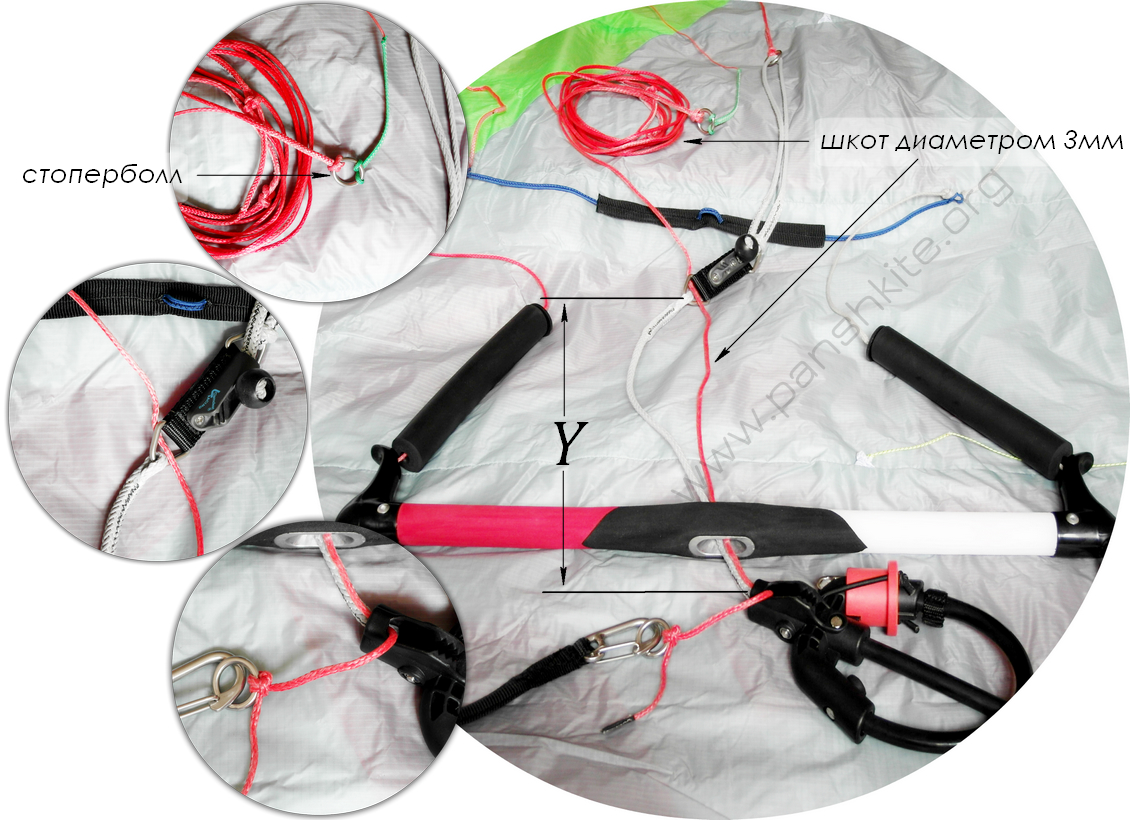 к страховочной пятой стропе стопербол и шкот из Dyneema длиной 5м +/- и диаметром 3мм +/-