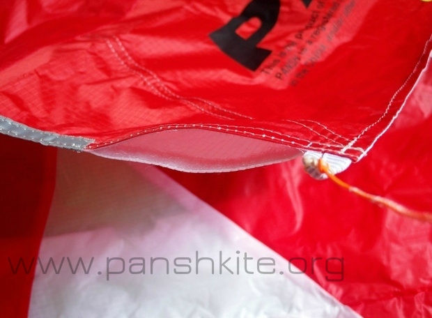 - Для максимальной безопасности и возможности сбросить тягу в сильный ветер, на кайте предусмотрена система страховки с пятой стропой, которая может быть быстро установлена пользователем или демонтирована в слабые ветра. Пятая стропа под куполом цепляется за красный узелок на верёвочке, которая собирает вместе четыре стропы, вшитые по линии центральной хорды кайта. Перед повторным рестартом купола, после активации страховки с пятой стропой, необходимо устранить возможное скручивание строп.